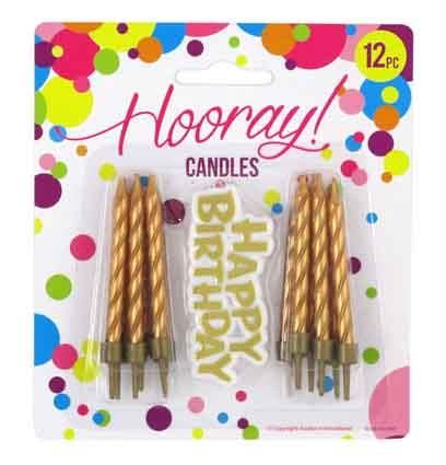 12 gold spiral candles with a HAPPY BIRTHDAY cake decoration.