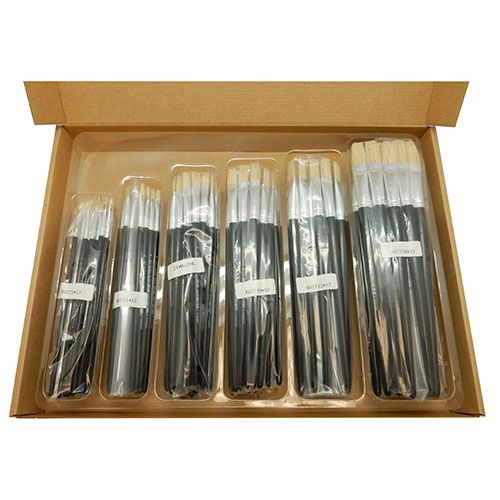 Good quality multi purpose brush with a flat head made of Chinese bristle with a medium length handle. Suitable for all water and oil based products.Contains 24 brushes of each size in a plastic storage tray. Brush sizes: 2 4 8 10 12 & 16