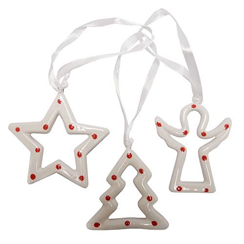 A beautiful set of 3 ceramic hanging decorations in the latest design. Packed in a gift box with a clear lid. Each item is 6 mm high.