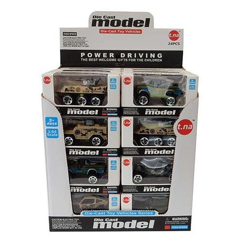 6 different Diecast vehicles in this camoflague army series. Scale 1:64. Display of 24.