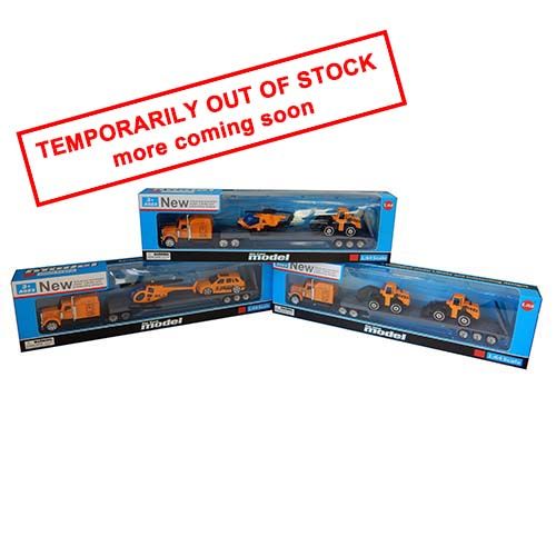 A diecast big rig truck and trailer combination with 2 other vehicles. 3 assorted styles. Other 2 vehicles are variations of digger, helicopter, loader & 4WD car.