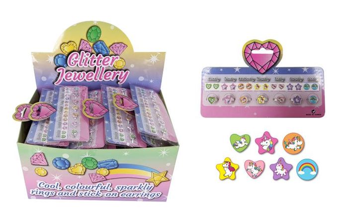 7 different sets of stick on earrings and matching ring per card. 36 in a display box.