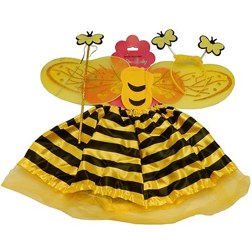 Cute as a bee. Striped skirt with buzzy wings, a headband and wand.