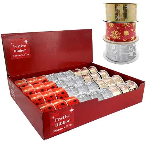 This festive ribbon comes in 3 colours . Each ribbon is 3.8cm wide and 2.7m long. 36 in a display box.