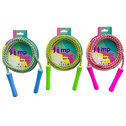 4 assorted colours. Skipping rope measures 2.4m includes handle. Presented on a card.
