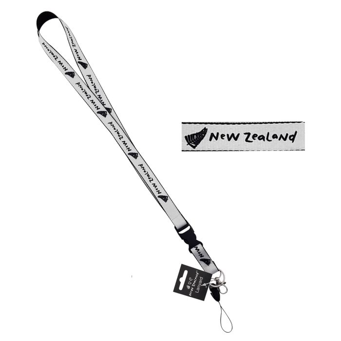 This black and white lanyard features the iconic NZ Fern and New Zealand in print. 19mm wide and includes carabiner clip