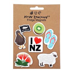 A set of 6 fridge magnets of recognisable New Zealand icons. Magnets: Kiwifruit, Jandals, Sheep, Pohutakawa, Kiwi with flag, I Heart NZ. Measures: 55 - 60 mm
