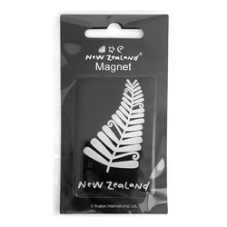 A rectangular silver fern magnet on a backing card. Made from epoxy, this magnet is 5cm wide x 7.5cm tall