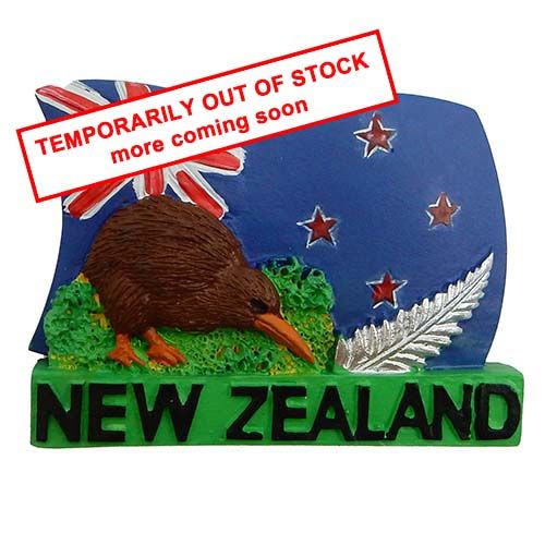 A magnet highlighting some of New Zealand's icons. This design can also sit freestanding in addition to being a magnet. Made from poly resin and is hand painted. Size: 6.5x5 cm.
