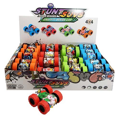 A friction action car which will flip and change direction when hitting a solid object. 4 assorted colours. Each car 8cm long x 7.5cm wide. 20 in a display box.