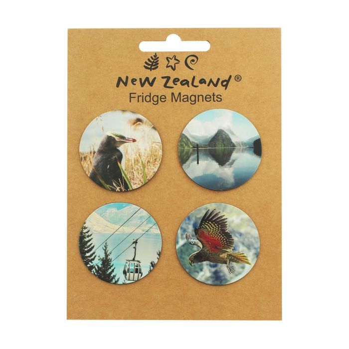A set of 4 fridge magnets of recognisable South Island icons. Measures: 55 mm
