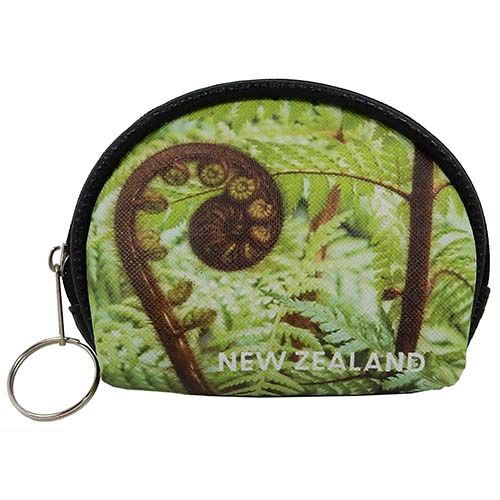 10 cm wide native fern design purse. Made from Neoprene, a synthetic rubber and very flexible. Has a zippered closure.