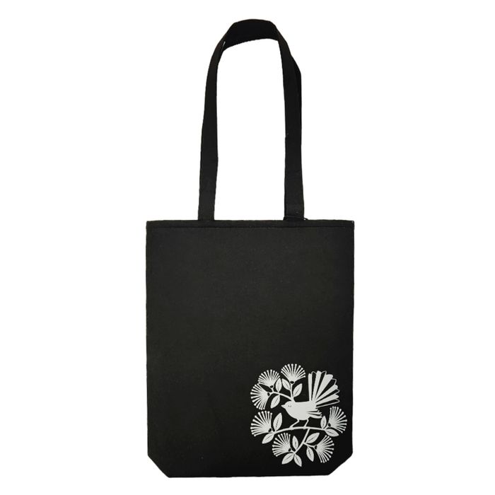 A tote bag with a printed New Zealand fantail and pohutakawa design. Material: Rpet Felt. Size:38cmH x 32cmW x 7cm base