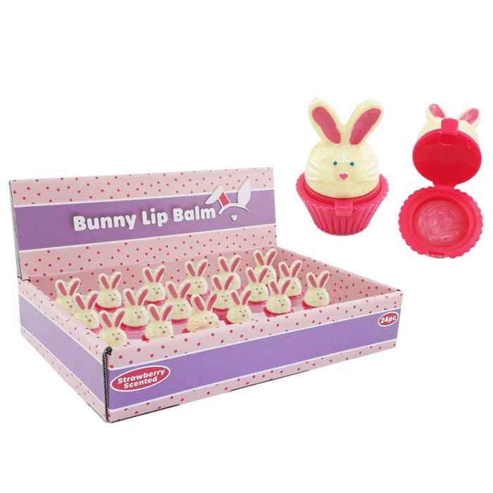 Strawberry flavoured lip balm in a pink and white bunny shaped container. 24 per display