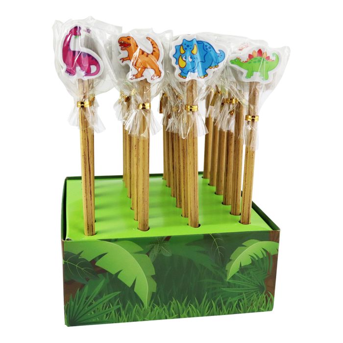 Assorted pencils with dinosaur erasers topper. 4 assorted: purple, orange, blue, green. Sold by display of 24 only.