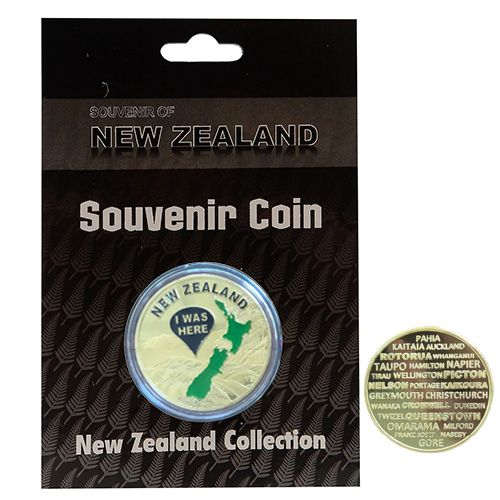 A double sided gold souvenir coin of New Zealand featuring a map of New Zealand on one side and place names on the other. 4cm in diameter.