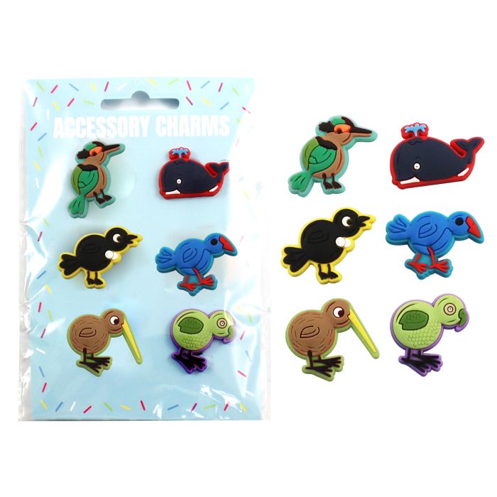 A pack of six assorted New Zealand wildlife shoe charms. These charms are best suited for decorating croc style shoes. 6 Assorted: King Fisher, Whale, Tui, Pukeko, Kiwi, Kea.