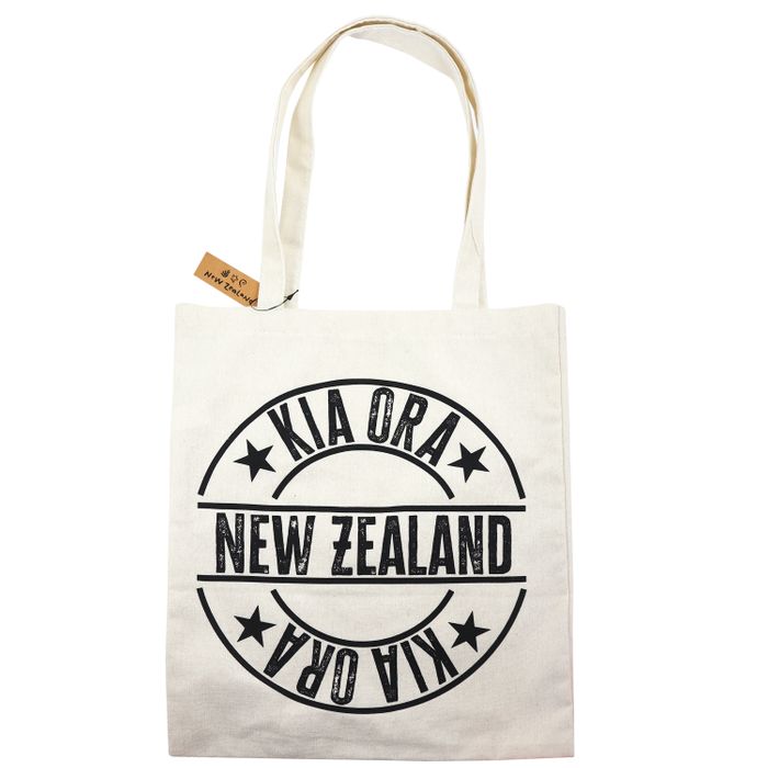 A cotton tote bag with a Kia Ora New Zealand design. Add a touch of New Zealand culture to your everyday with this handy tote bag, perfect for shopping. Bag Size: 40cmH x 38cmW (no gusset). Handle Size: 2.5cmW x 59cmL