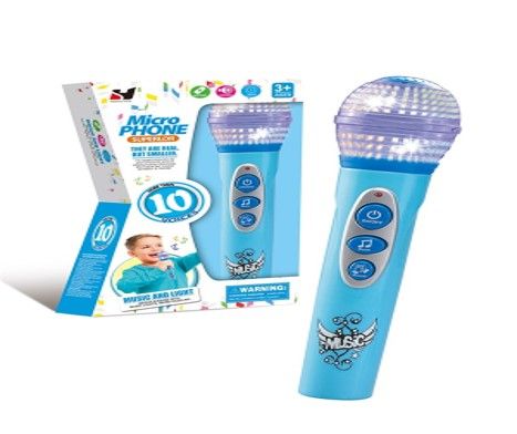 A microphone with music, different sounds and lights. 10 different settings. Great for children to sing along with and feel like a star. Requires 2xAA batteries. Agest 3+