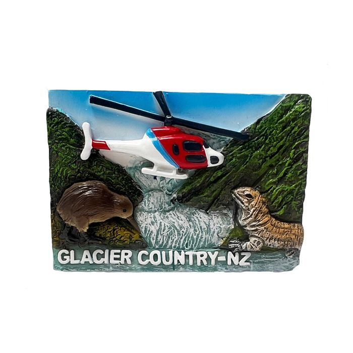 A great memento to remember New Zealand's glaciers and our iconic tuatara and kiwi. This design can also sit freestanding in addition to being a magnet. Made from poly resin and is hand painted. Size: 7x5 cm.