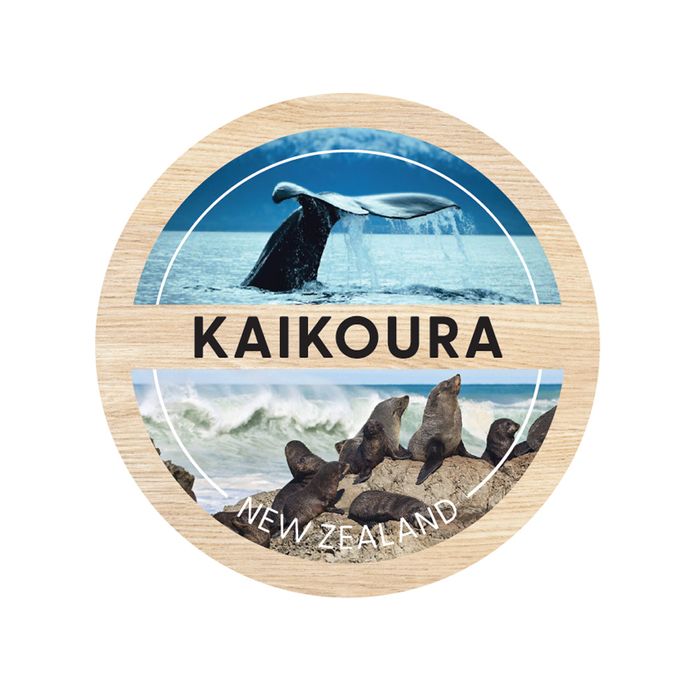 Kaikoura themed wooden round magnet. 70mm in diameter