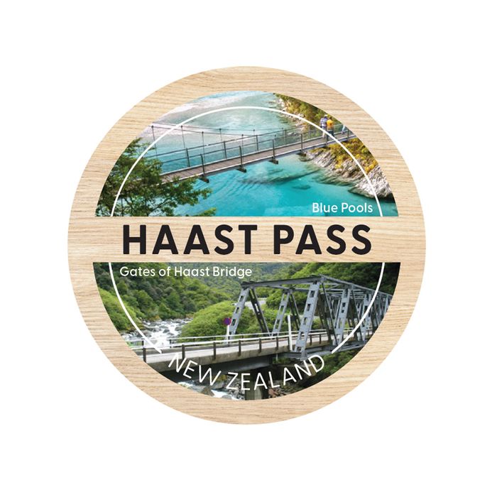 Haast Pass South Island themed wooden round magnet. 70mm in diameter