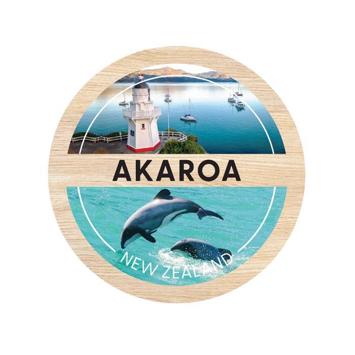 Akaroa South Island themed wooden round magnet. 70mm in diameter