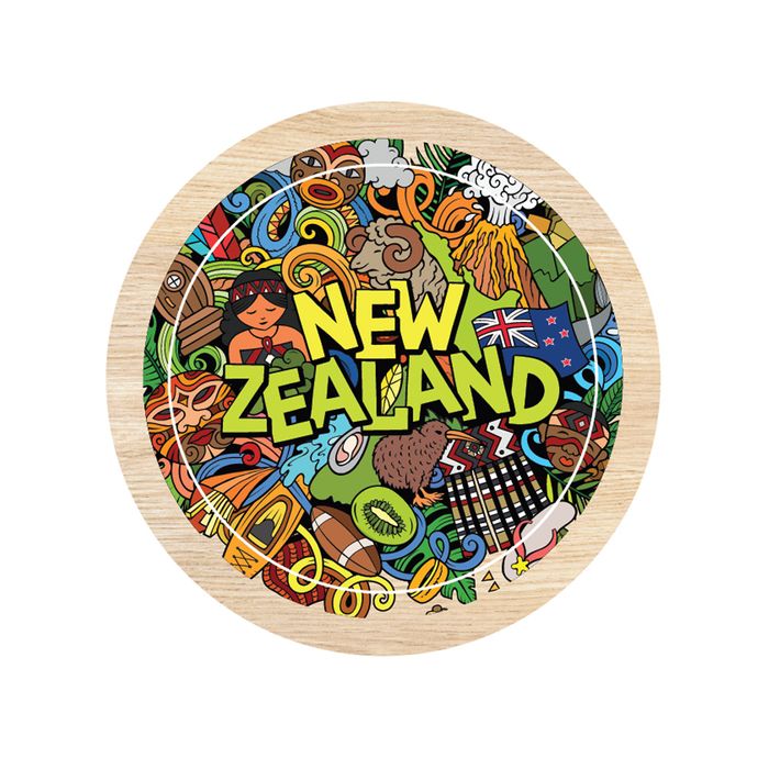 Some of New Zealand's icons feature on this colourful wooden round magnet. 70mm in diameter