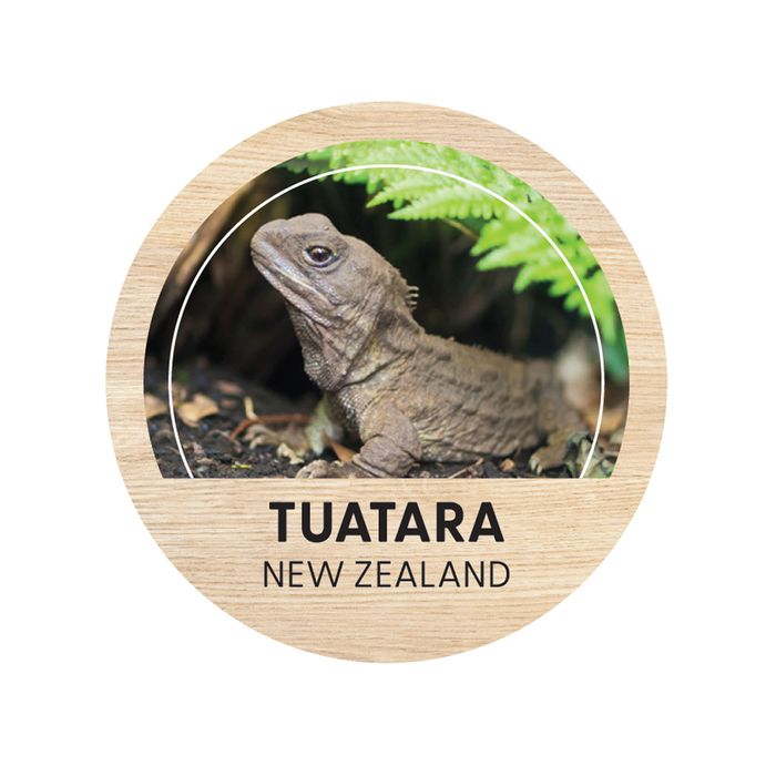 New Zealand's amazing tuatara features on this wooden round magnet. 70mm in diameter