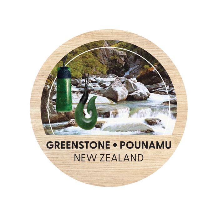 New Zealand's greenstone or pounamu is found in rivers as shown on this wooden round magnet. 70mm in diameter