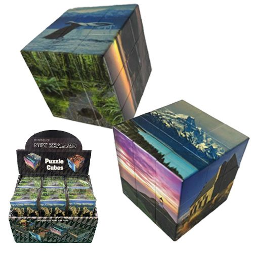 Something new in the souvenir line... a cube puzzle with New Zealand wonders and iconic scenes. This 3x3 puzzle cube comes in 2 designs and works just like a Rubiks cube. Display of 12 which is 6 of each cube.
