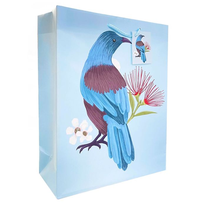 Large blue gift bag with a tūī bird, manuka and pōhutukawa flower print. Size; 26.7x33x11.4cm