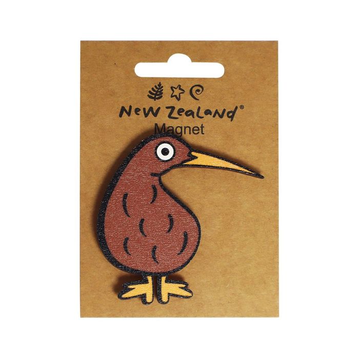 A wooden, New Zealand Kiwi magnet. Size; 6.5 cm x 4 cm x 3 mm thick