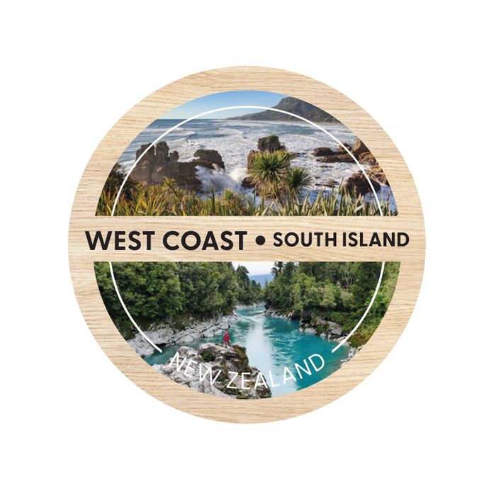 Wooden round magnet featuring scenes of the West Coast of the South Island. 70mm in diameter