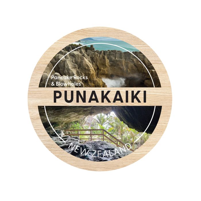 Wooden round magnet featuring scenes of the iconic Pancake Rocks and Blowholes and also The Cavern in Punakaiki. 70mm in diameter