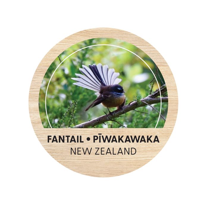 New Zealand's fantail features on this wooden round magnet. 70mm in diameter