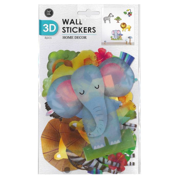 Decorate your room with these wild animal stickers! With a 3D design and bright colours, these bold stickers are sure to stand out! Contains 6 stickers: zebra, lion, tree, leaf, tucan, elephant