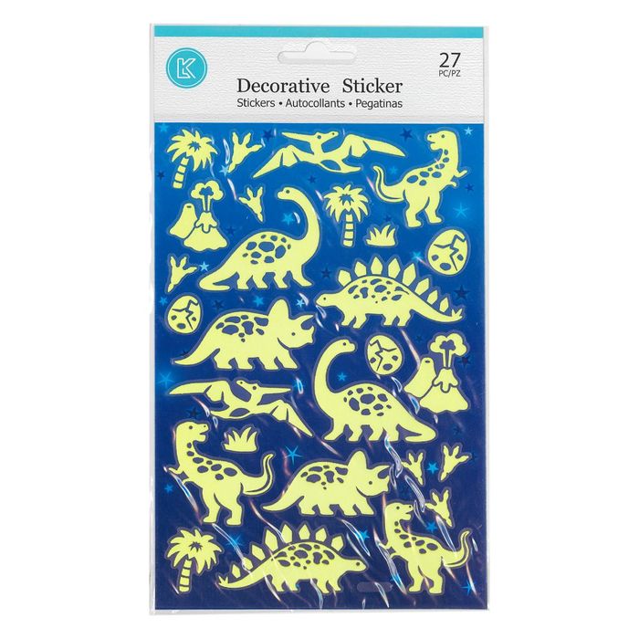 Glow in the dark assorted dinosaur stickers. 27 Stickers. Size: 250 x 145 mm