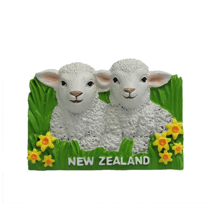 An iconic New Zealand scene of 2 cute lambs sitting in daffodils. Made from poly resin and is hand painted. Size: 7x5 cm approx.