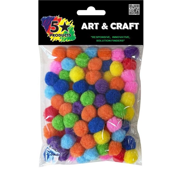 A 100pc pack of brightly coloured pom poms 2cm in diameter. Great for Art and Craft projects.