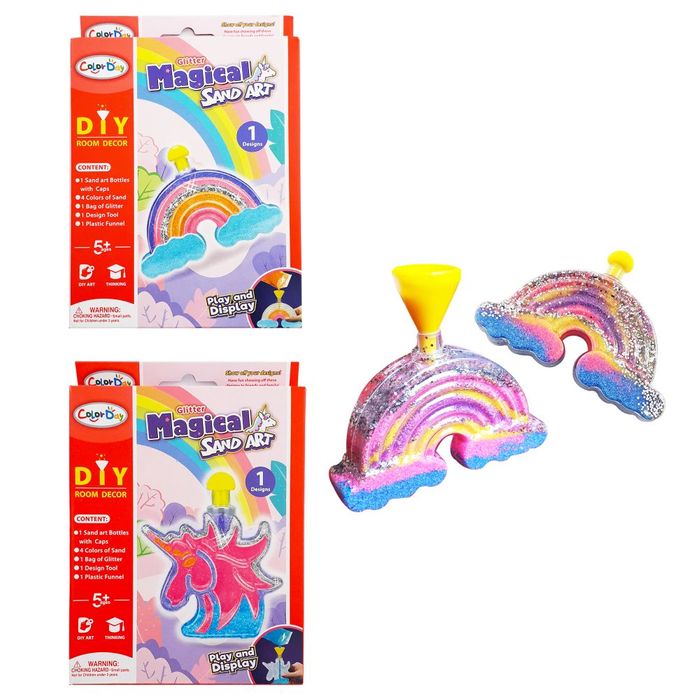Create your own sand art with these 2 assorted rainbow and unicorn kits. Add the coloured sand or glitter into the clear shape. 2 assorted - Rainbow and Unicorn. Ages 5+
