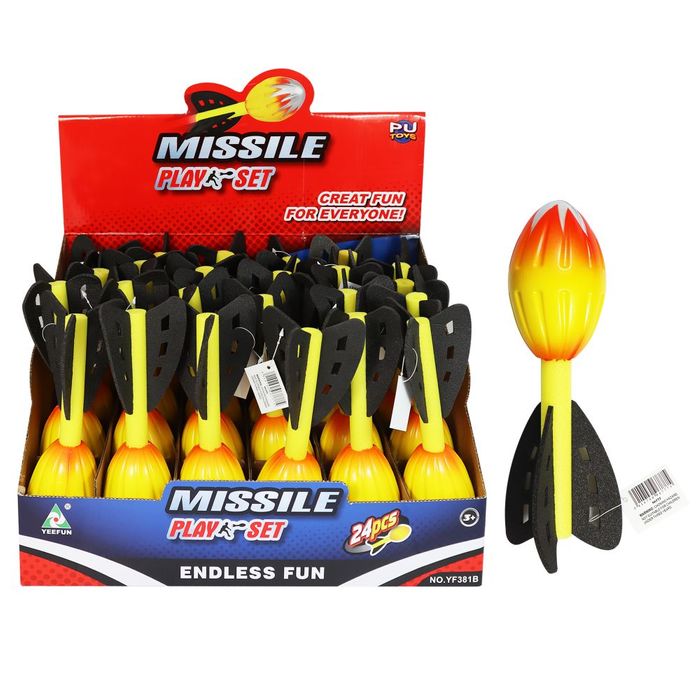 Launch the missile torpedo ball and watch it soar through the air! Crafted from lightweight foam, this missile promises thrilling backyard adventures every time. Suitable for ages 3+. 24 per display