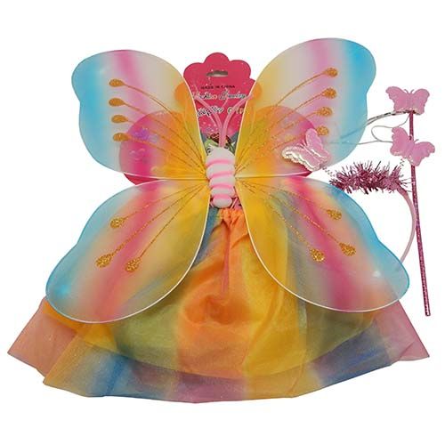 Rainbow skirt and wings with a butterfly headband and wand. 3 assorted colours.