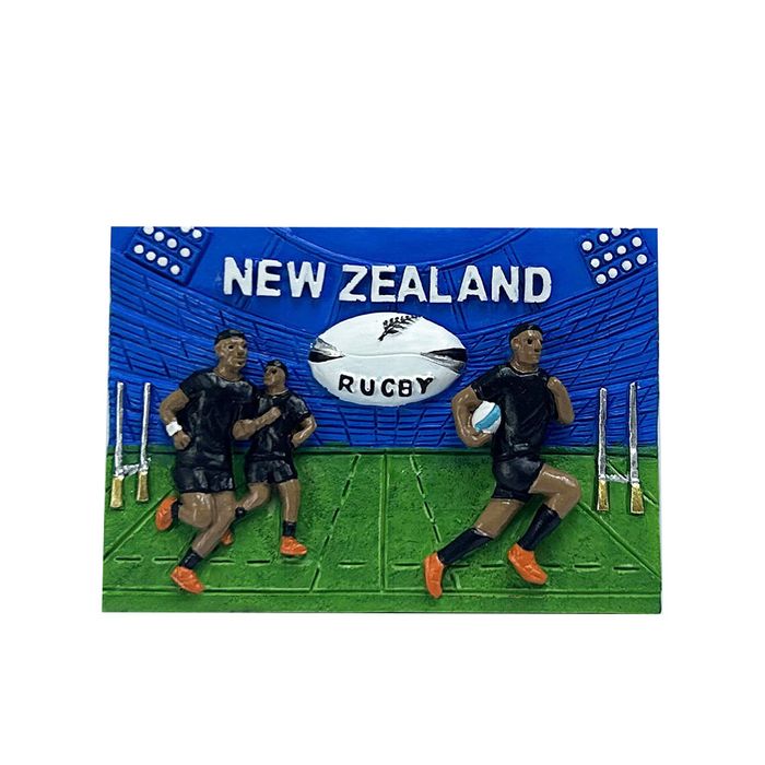 Iconic NZ rugby scene with players on the field at a stadium. Made from poly resin and is hand painted. Size 7cm high approx.