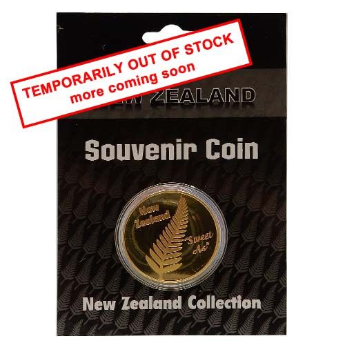 A double sided gold souvenir coin of New Zealand icons featuring the NZ fern and "Sweet As". 4 cm in diameter.