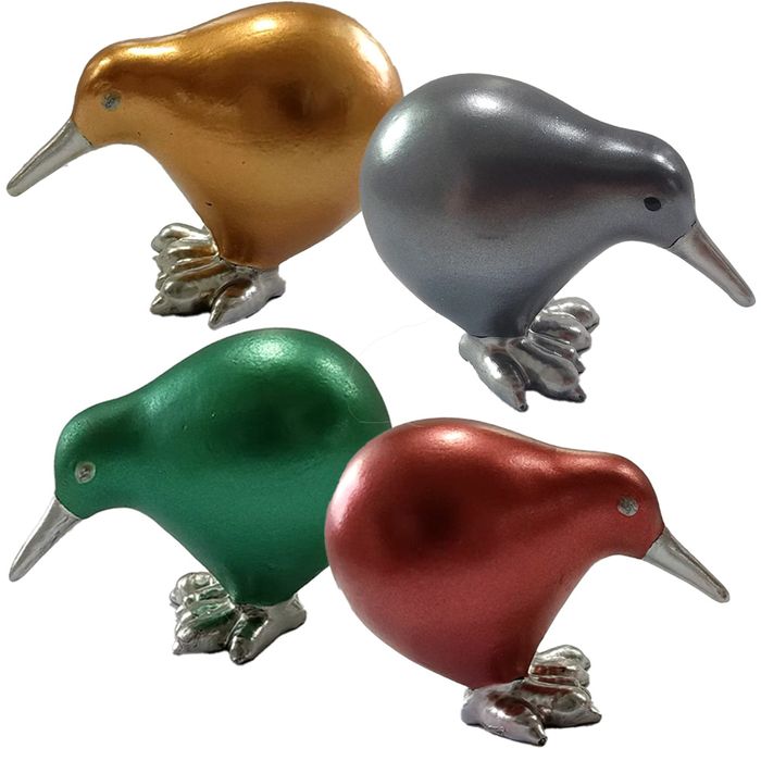 Little Kiwi souvenirs finished in metallic paint with silver features. Made from poly resin. Size 6.2x3.5x4.75 cm.