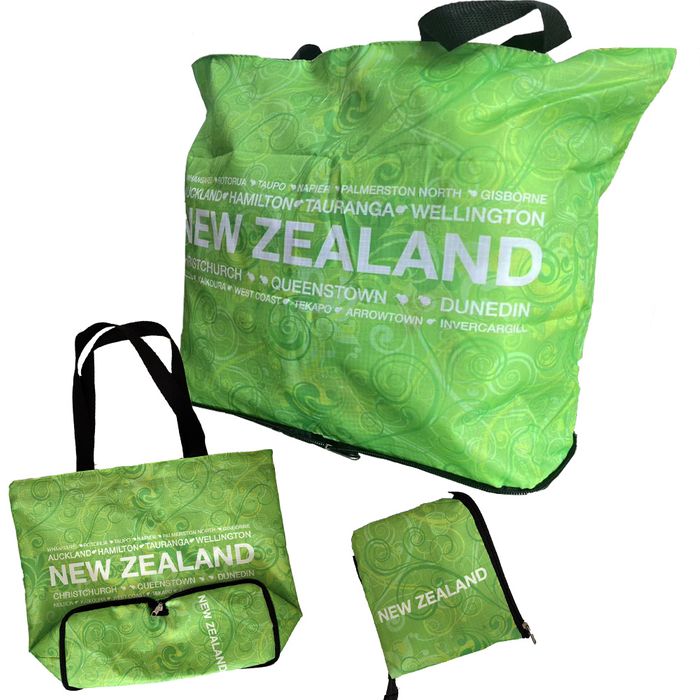 This colourful shopping bag folds up to 1/6 of the size and zips closed. Great for kiwis and also as a New Zealand souvenir. Made from heavy duty material, yet lightweight and compact for convenience. Open size 445 x 340 mm with a gusset with of 140 mm. Inner of 5.