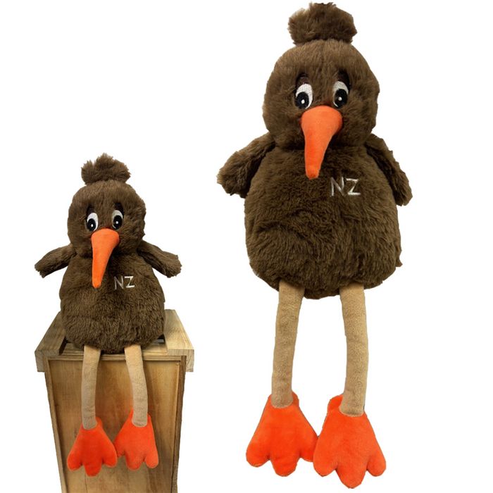 Kruz the cruisy Kiwi. Cute, soft and cuddly plush Kiwi. When he is not being cuddled he can sit on his bottom with his legs dangling free. Size 30cm.