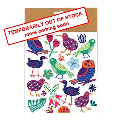 Assorted native New Zealand bird and flora stickers. This sheet features the Kiwi, Pukeko, Kea, Morepork, Pohutukawa, Fern and Clianthus. 1 sheet per pack.