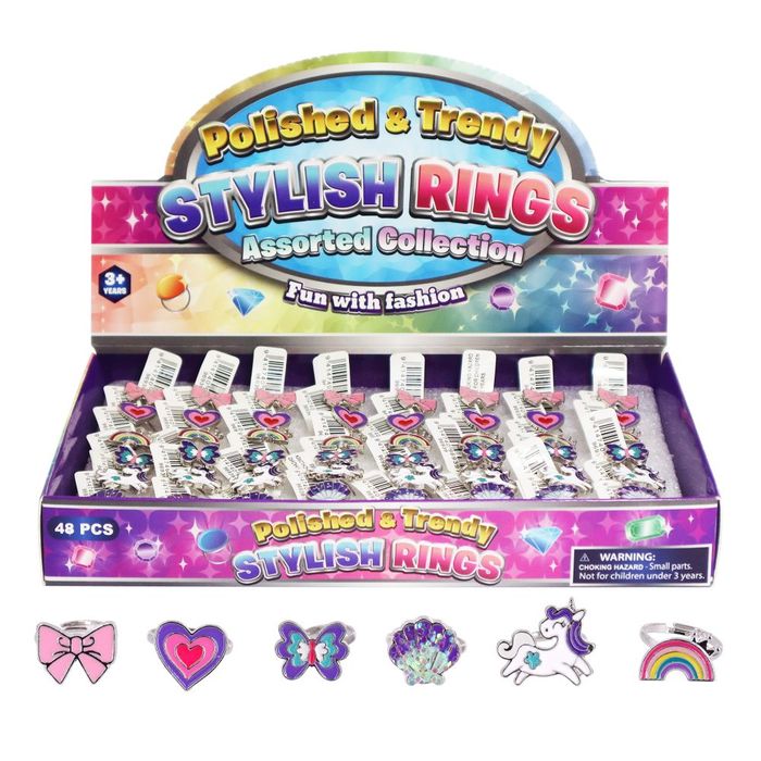 Express yourself with these playful and trendy fashion rings! Featuring adorable icons like bows, hearts, and rainbows. Suitable for young children aged 3+ 6 Assorted: bow, heart, butterfly, seashell, unicorn, rainbow. Display of 48
